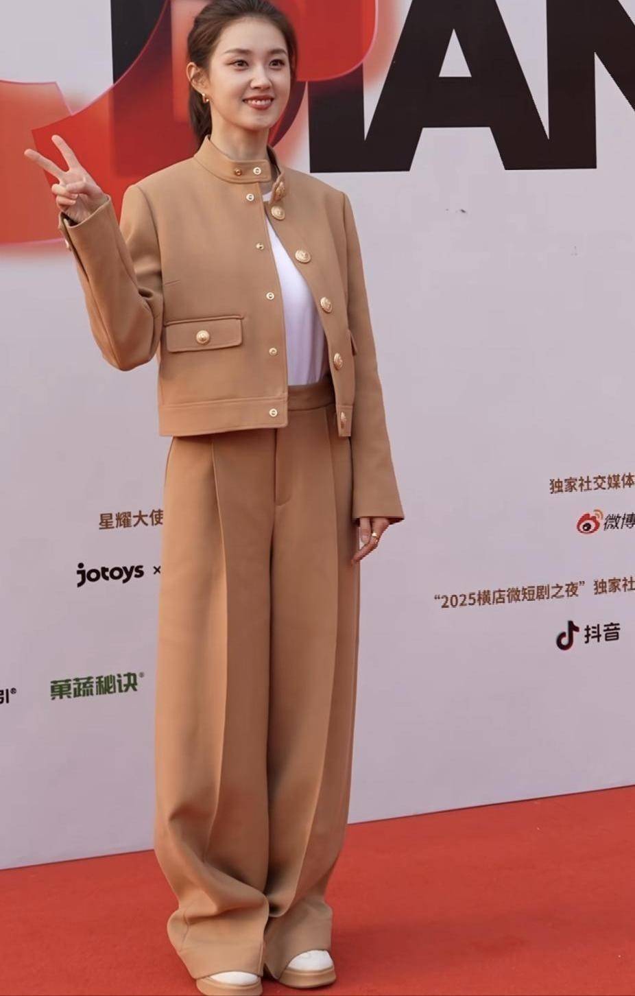 当天她扎着利落高马尾,外搭驼色西装套装,内搭白色T恤,脚踩简约小白鞋。整体穿搭干净利落,充满日常通勤感。略微丰满的上身线条和圆润的脸颊,反而透出健康的光泽与生活气息。